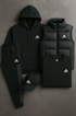 Discover the perfect balance of comfort, design, and sporty elegance with this complete Adidas tracksuit. Comprising a hoodie, quilted vest, joggers, a t-shirt, and a matching cap, this kit embodies a modern and refined look, ideal for all seasons.